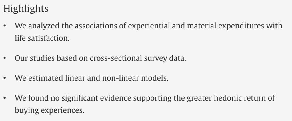 In their own words, “Although both experiential and material expenditures were positively associated with life satisfaction, we found no significant evidence supporting the greater return from experiential purchases.”