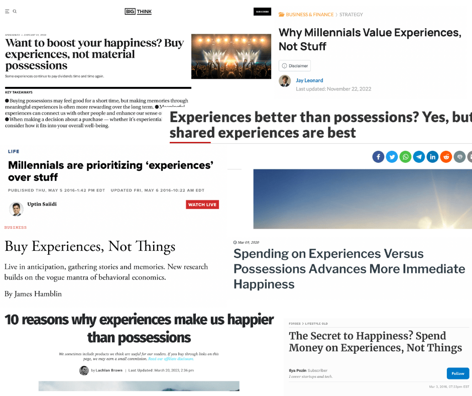 Here’s an interesting quote from Dr. Thomas Gilovich: “You can really like your material stuff. You can even think that part of your identity is connected to those things, but nonetheless, they remain separate from you. In contrast, your experiences really are part of you.”